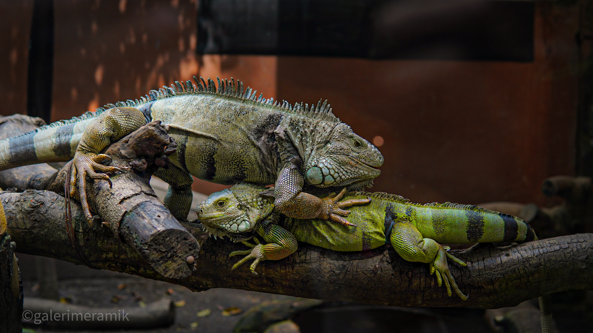 Di sisi lain, ada iguana yang sedang tumpuk-menumpuk diatas kayu yang mulai lapuk. Terlihat berat memang, tapi ia berinteraksi dengan sesama. Tidak seperti pelikan yang sendiri, ataupun jerapah yang justru bersama manusia.