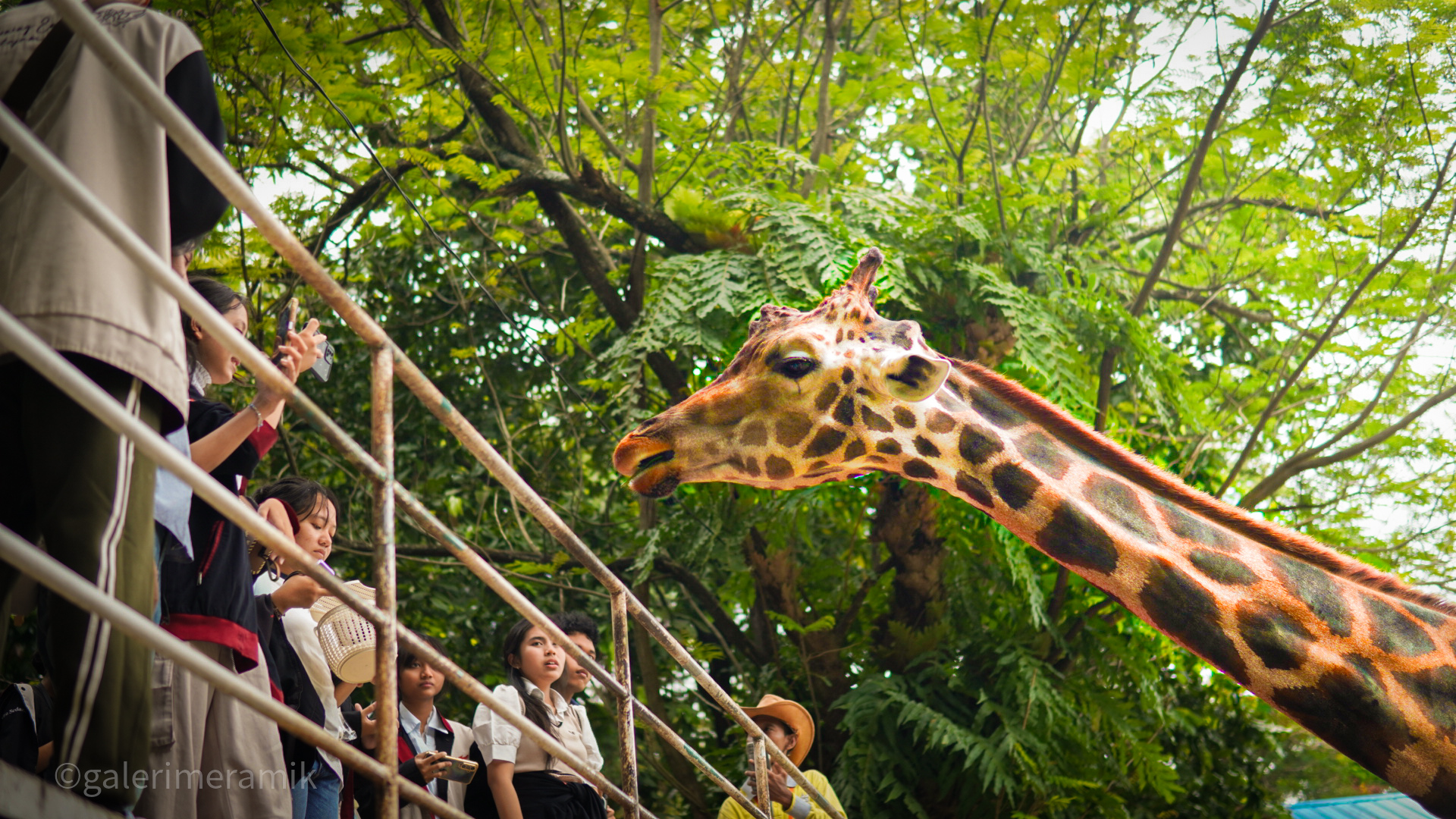 Paruh pelikan tersebut berbanding terbalik dengan leher sang jerapah yang mendongak ke atas. Leher yang panjang itu membantunya untuk meraih manusia, yang menjadikannya sarana rekreasi. Tapi hey, dia mendapatkan makanan disini, bukan?