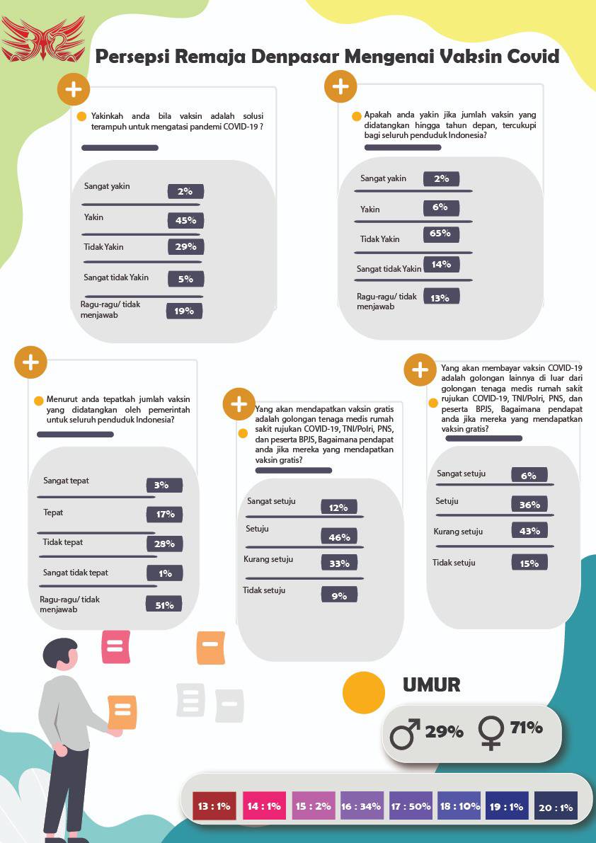 Sebagian ada yang menghembuskan napas lega, lainnya ada pula masyarakat yang meragukan efektivitasnya. Reaksi masyarakat mendengar perihal vaksin Covid-19 memang beragam macam. Dari segi jumlah hingga sistem pembagian nantinya turut mengundang beberapa opini. Lantas bagaimanakah persepsi remaja Denpasar terkait jaminan vaksin Covid-19?