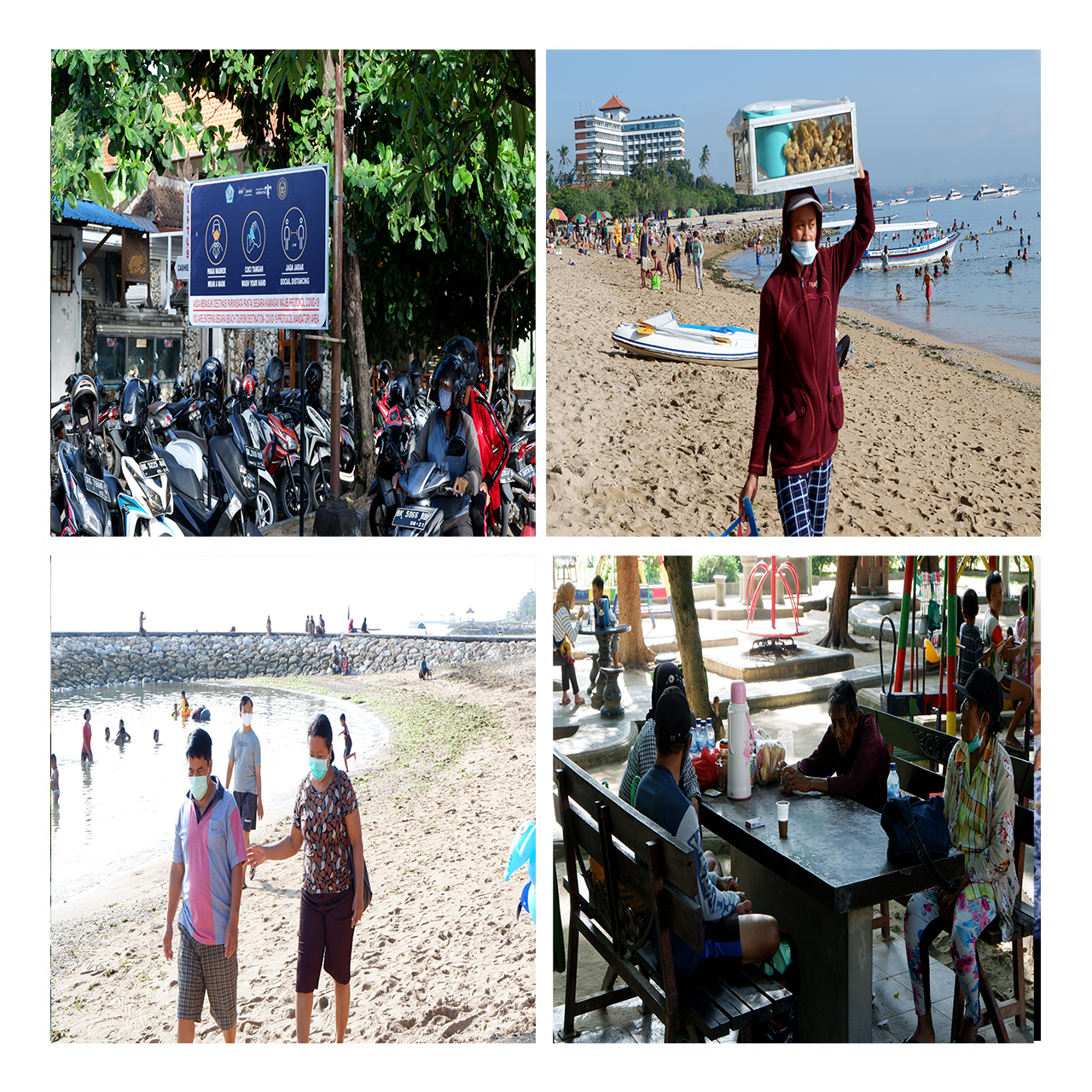 Pasalnya banyak penambahan kasus positif covid di Indonesia akhir-akhir ini, apalagi angka kematian kasus covid juga semakin melonjak pada saat ini. Semua itu di karenakan kegiatan liburan akhir tahun ini. Saking sudah acuh tak acuhnya terhadap penyakit yang berbahaya ini, tampak cukup banyak masyarakat yang nekat keluar rumah untuk berlibur. Terlanjur ingin melepas penat selama ini. Hal itu terlihat dari Kawasan parkiran Pantai Sindhu yang dibanjiri sepeda motor pengunjung pada hari Jumat, tanggal 25 Desember 2020. Melihat peluang itu, pedagang kecil berlomba-lomba mengais rezeki di tengah pandemi dan krisis ekonomi. Terutamanya pedagang lumpia yang sudah identic, kerap lalu Lalang di pesisir pantai. Meski sudah berbekal dan mengenakan masker. Tak jarang, masker itu akan berakhir terpelorot di dagu. Apalagi protokol Kesehatan menjaga jarak sudah jelas tampak gagal diterapkan. Dalam euphoria liburan memang terkadang masyarakat lupa diri. Terlampau hanyut dalam kesenangan. Seperti di beberapa sudut Lapangan Puputan. Masyarakat tak sadar berkerumun, membabat batasan jarak. Memang terlihat asyik mengobrol di bawah pohon yang teduh, lengkap ditemani bersama bayang-bayang peluang kluster baru.